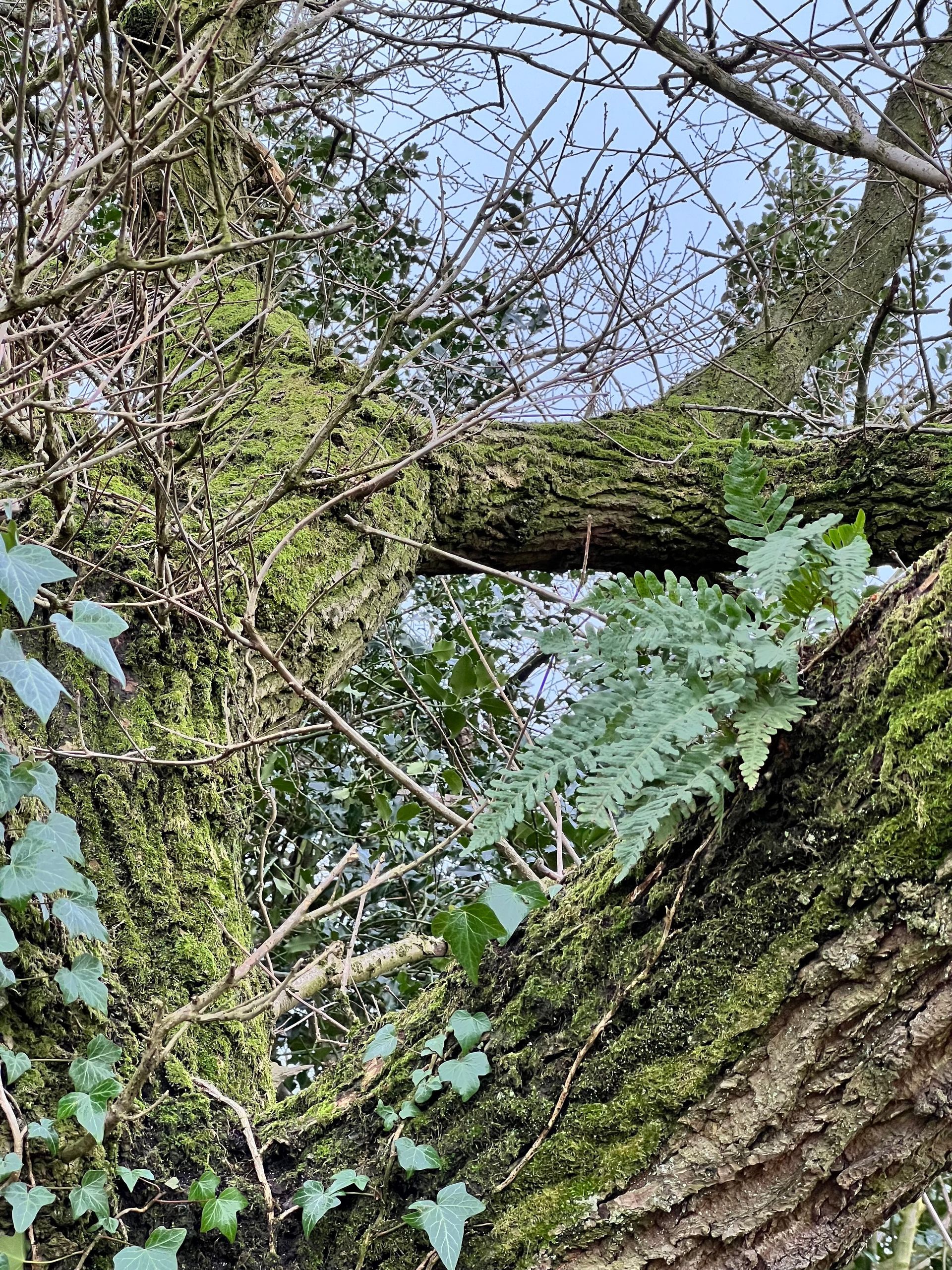 At our Doehole vineyard we think we have the right conditions already in place that show signs of being a rainforest like environment. We have a sheltered, steep sided location at the bottom of our vineyard, an ancient Holloway (a road carved into the landscape by centuries of use) that supports old oak, alder and willow trees with epiphytes (non-parasitic plants growing on living trees), an array of interesting lichens, mosses (bryophytes) and ferns.